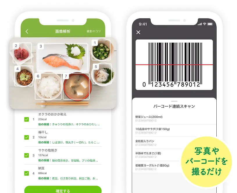 食事写真や商品バーコードを "撮るだけ" で簡単にカロリー計算と食事記録ができるアプリです。