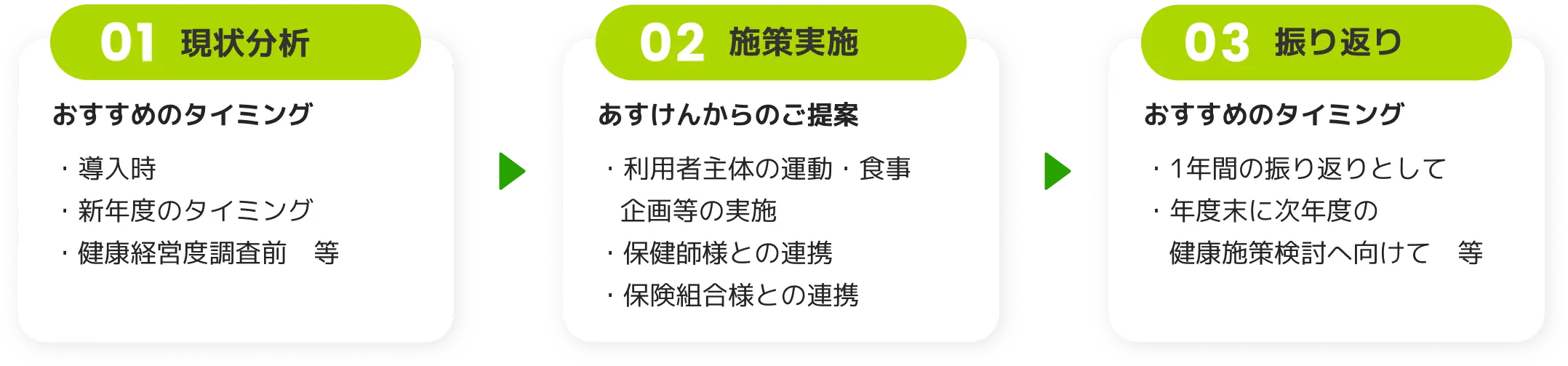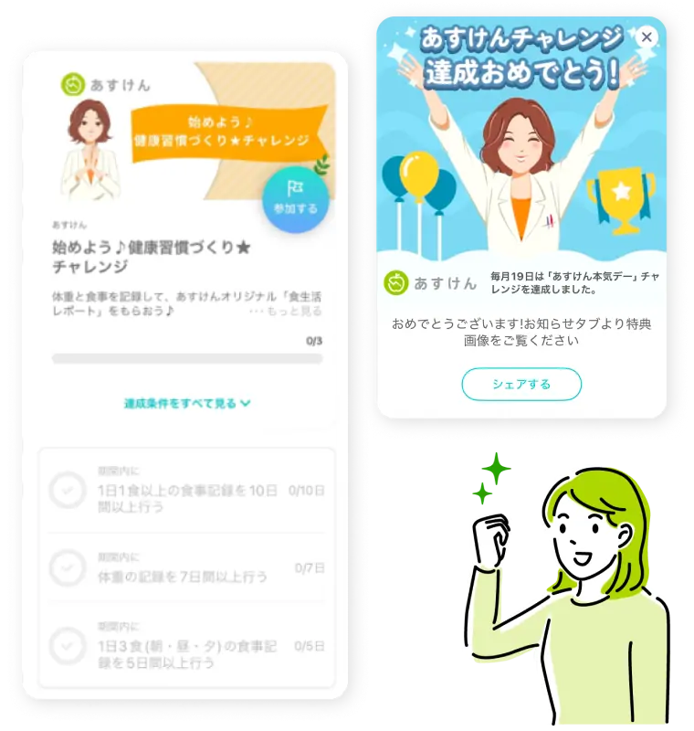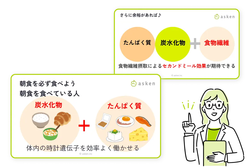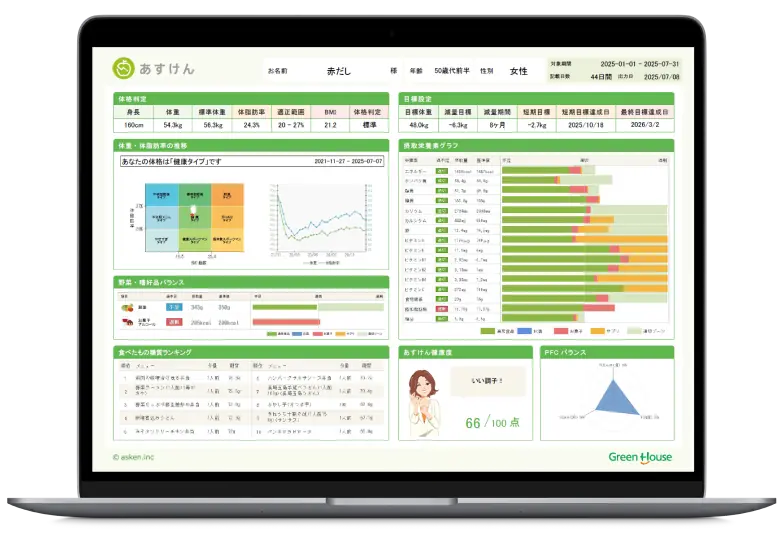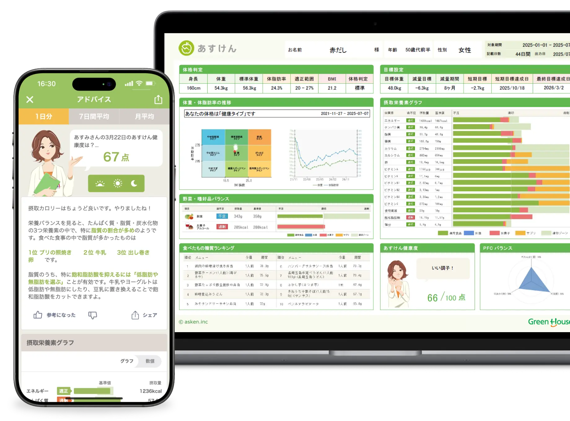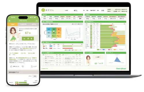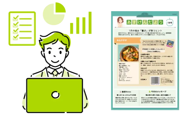 あすけんが提供する法人プラン「あすけんプラス」では、これまで沢山のかたに『あすけん』を利用していただき培ってきた「データ」と「ノウハウ」を法人様でも活用いただくことで、課題の解決や人的資本経営へお役立ていただけます。